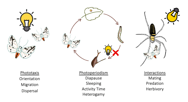 To nocturnal creatures, intrusive light in the nighttime niche poses a considerable threat. ALAN is one of the suspects behind global insect declines- a reasonable link considering more than 60% of all insects are nocturnal during at least one life stage. ALAN disrupts circadian entrained biological processes. In insects, these include phototaxis (attraction to light) and photoperiodism (the timing of life activity based on light cues). ALAN can also change the dynamics of intra and interspecific species interactions: notably, there have been observations of diurnal predators and parasitoids shifting to nocturnal activity under ALAN.