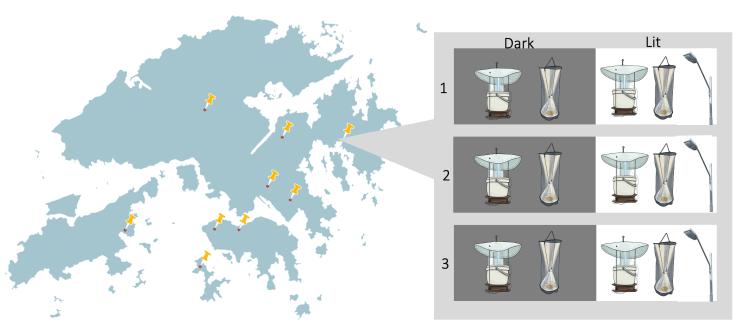We selected 9 sites across HK to represent low to high levels of sky glow. Each site had three sub-sites with two treatments each: a lit treatment, where traps were placed directly under a streetlamp, and a dark treatment, where traps were placed 10 meter away in a dark area.